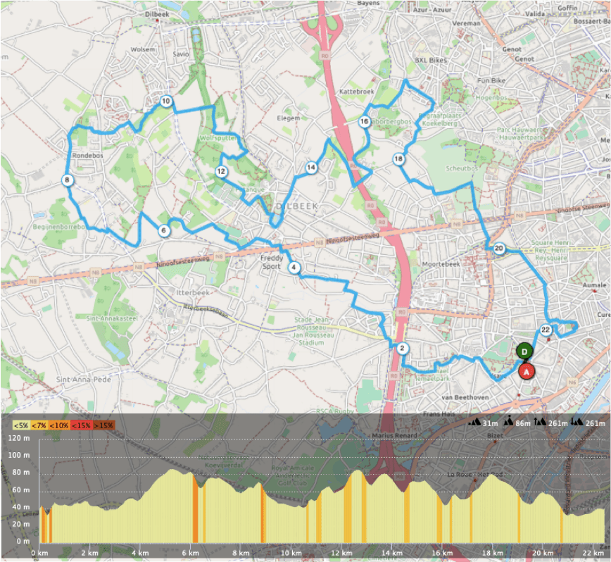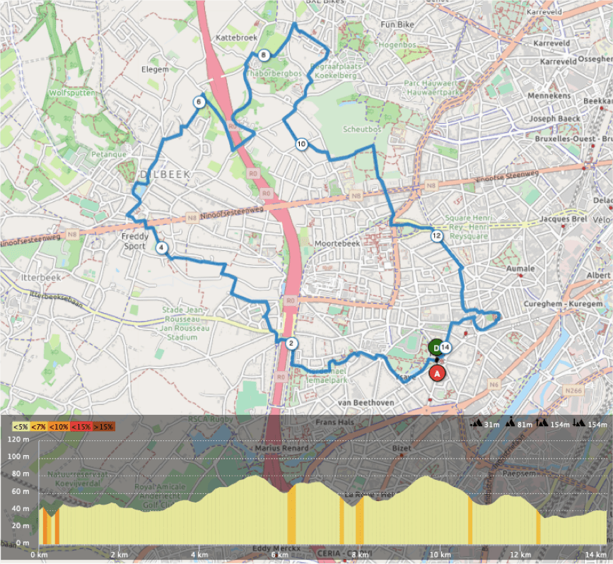 Description: Ces deux parcours qui débutent au niveau du parc Astrid sont un mélange de décors urbains, de campagne et de passages plus boisés. Les deux boucles vous emmènent entre Anderlecht et Dilbeek, petite commune située à l’ouest de Bruxelles en région Flamande. Pour les parties communes aux deux tracés, on peut apercevoir entre autres la très belle maison communale de Dilbeek, un peu de street art à Anderlecht, la chouette petite rue Porselein et ses maisons colorées, le Scheutbos, la collégiale Saints-Pierre-et-Guidon. Pour le parcours allongé, il permet d’aller faire un tour du côté des réserves naturelles du Wolfsputten et du Begijnenborrebos. Ces itinéraires permettent de s’évader un peu en dehors de Bruxelles sans jamais y être très loin et ont l’avantage de faire découvrir de très beaux coins à Anderlecht.