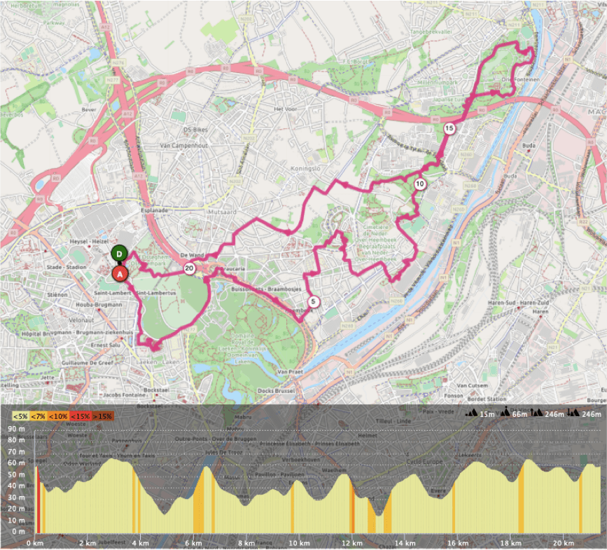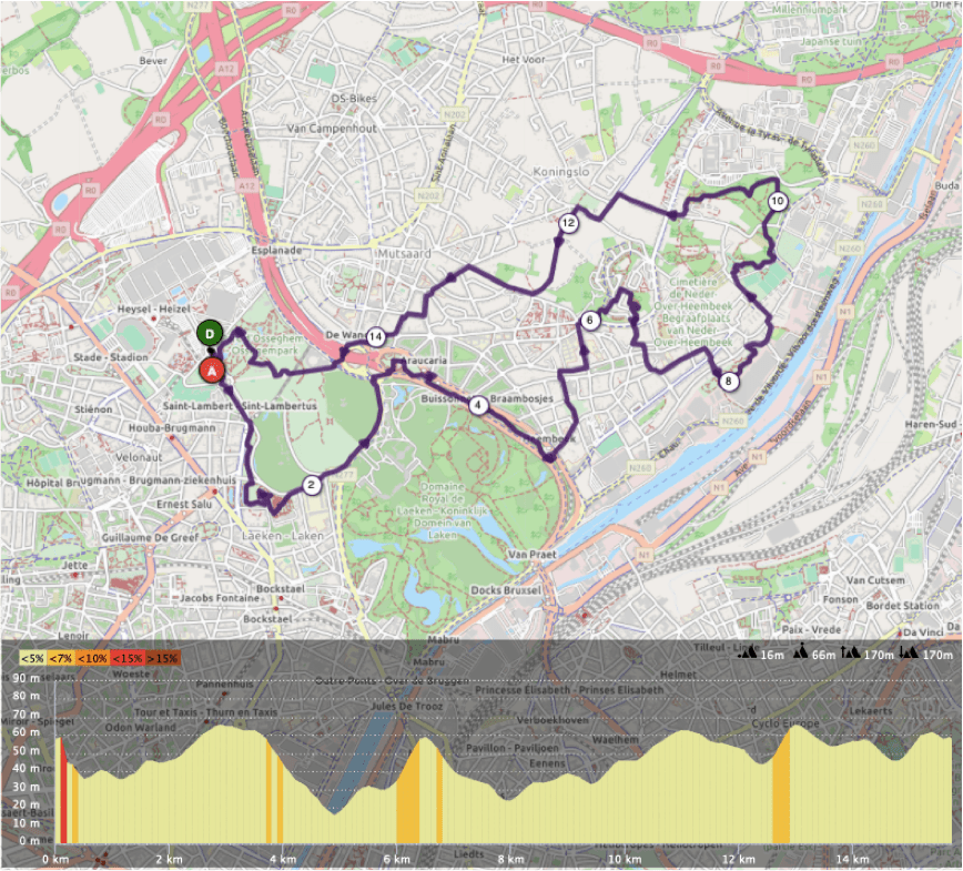 Description: Ces deux parcours débutent au pied de l’Atomium et sincèrement commencer une sortie running par ce lieu, c’est toujours bien sympa! Dès le début, les parcours vous permettent de voir de chouettes choses comme les jardins du Fleuriste juste après avoir traverser le parc Stuyvenberg. Quelques centaines de mètres plus loin, on peut successivement apercevoir la fontaine Sainte-Anne, le monument de la dynastie, le château de Laeken, les serres royales, le pavillon Chinois et la Tour Japonaise. Le tracé vous emmène ensuite en direction de la commune de Neder-Over-Heembeek. Un passage par Versailles et quelques street arts plus tard, on tombe sur la chouette église Saint-Nicolas avant dans plonger dans le parc Meudon. À sa sortie, juste après le 8ème kilomètre, l’itinéraire permet d’observer la Tour Romane de Neder-Heembeek. Au niveau du km 10, le parcours de 21 km vous embarque faire un tour dans le domaine des trois fontaines du côté de Vilvoorde. Cette boucle supplémentaire faite, la fin des deux parcours sont identiques avec un passage au niveau de la station de tram De Wand dont les amatrices et amateurs de street art apprécieront la décoration. De ce lieu, il ne reste qu’un dernier kilomètre à parcourir pour rejoindre à nouveau l’Atomium.