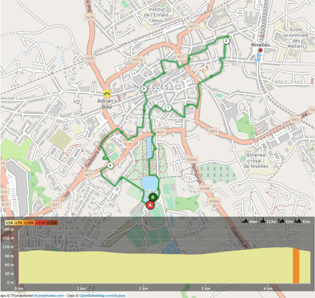 Le premier parcours (4.6 km) s’effectue uniquement dans le coeur de la commune et peut d’ailleurs se faire aussi bien en marchant en étant de passage à Nivelles. Il permet de découvrir de jolies choses dans le centre de la commune comme le parc de la Dodaine, l’église Saints Jean et Nicolas, la porte de la rue de saintes, Notre Dame du Saint Sépulcre et Saint Paul, la Grand Place de Nivelles, le superbe bâtiment du tribunal de première instance du BW, la Collégiale Sainte Gertrude, deux charmantes ruelles (rue du Wichet et rue Gillard-Heppe) et enfin la tourette de Nivelles (rien à voir avec celle de Gilles…).