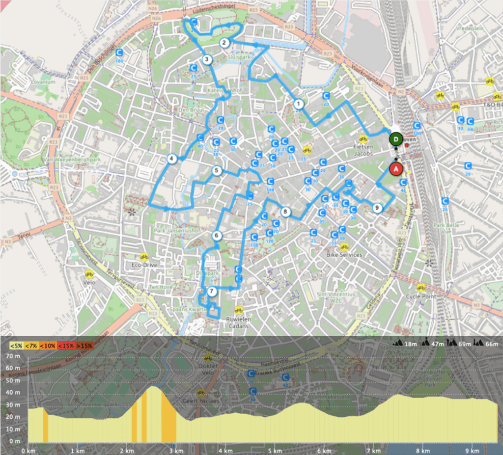 Point d’arrivée: Au niveau de la gare de train de Leuven, les deux parcours étant des boucles.