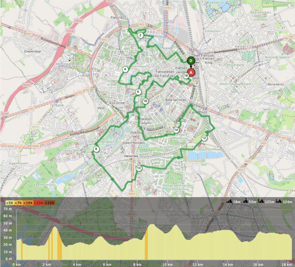 Le second parcours (18.2 km) passe par exactement les mêmes lieux et s’allonge à mi-chemin pour se diriger vers le sud de la commune. Ce bonus kilomètrique vous emmène voir quelques petites pépites supplémentaires comme un chouette passage par le campus de la KUL, le château Arenberg, l’Abbaye de Parc, le Tivolibrug (et ses nombreux graffitis), le bâtiment de la prison centrale de Leuven pour ne citer qu’eux.